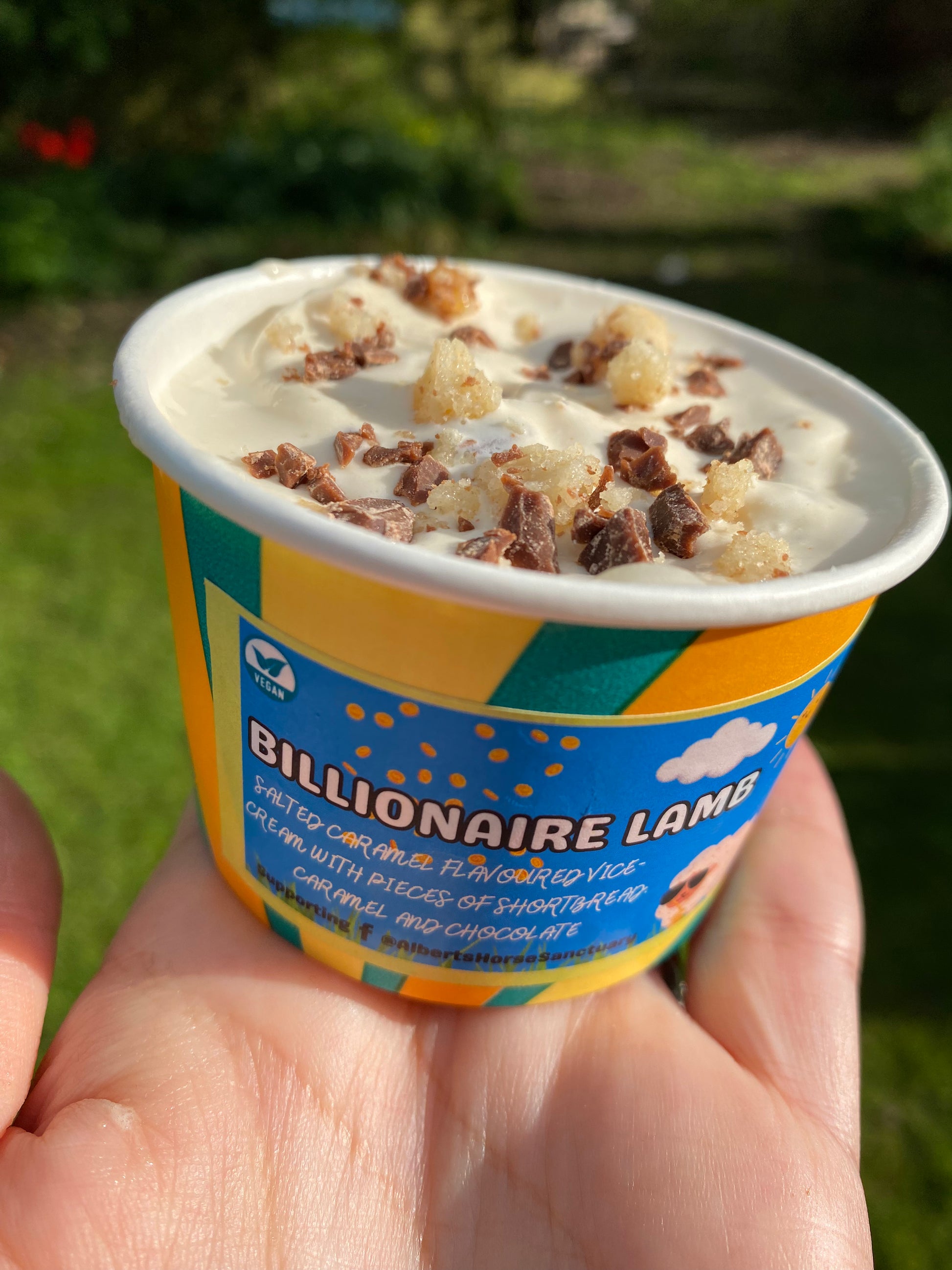 Billionaire Lamb - Salted caramel flavoured v-ice cream, with chunks of shortbread, chocolate and caramel pieces.